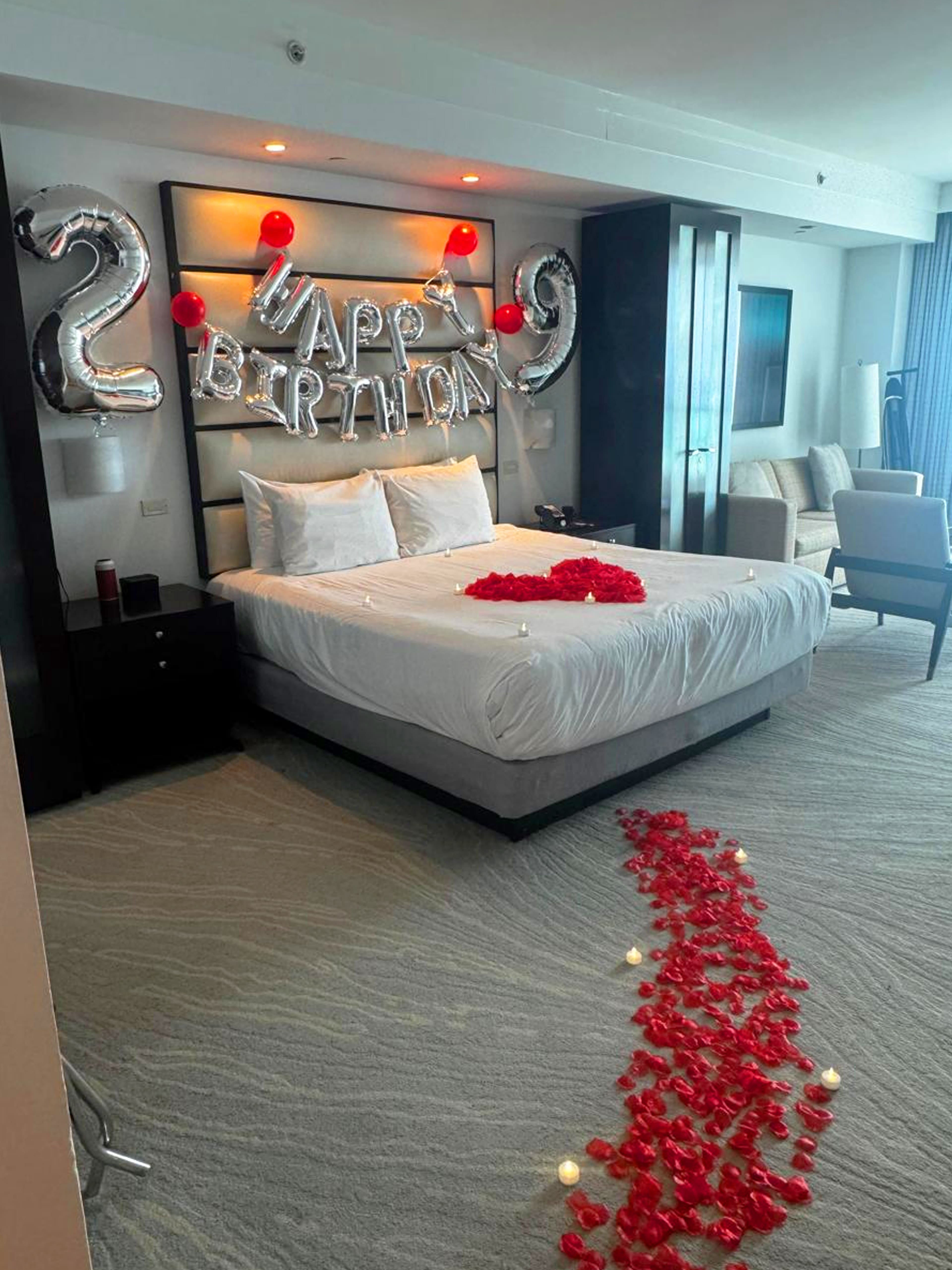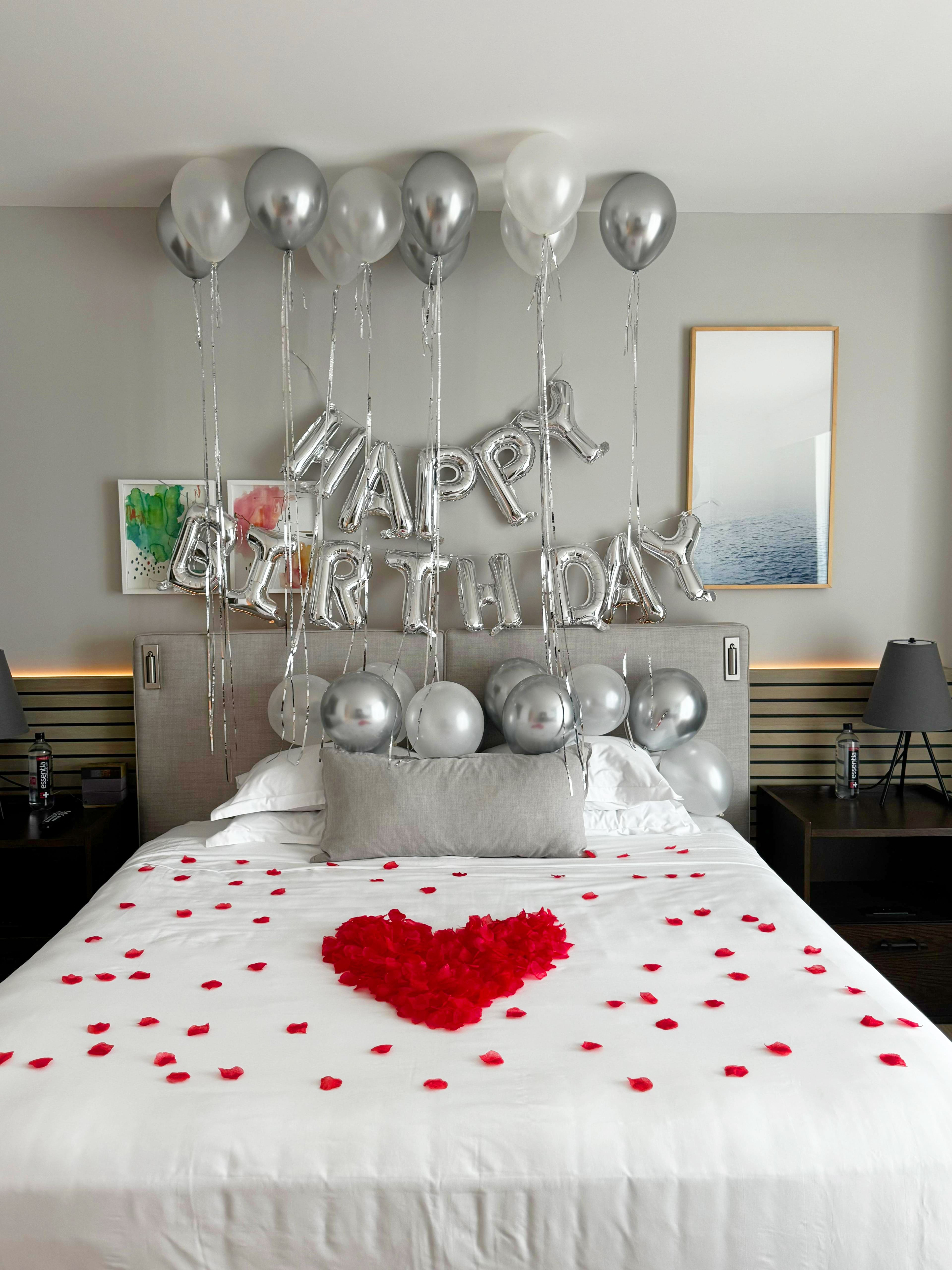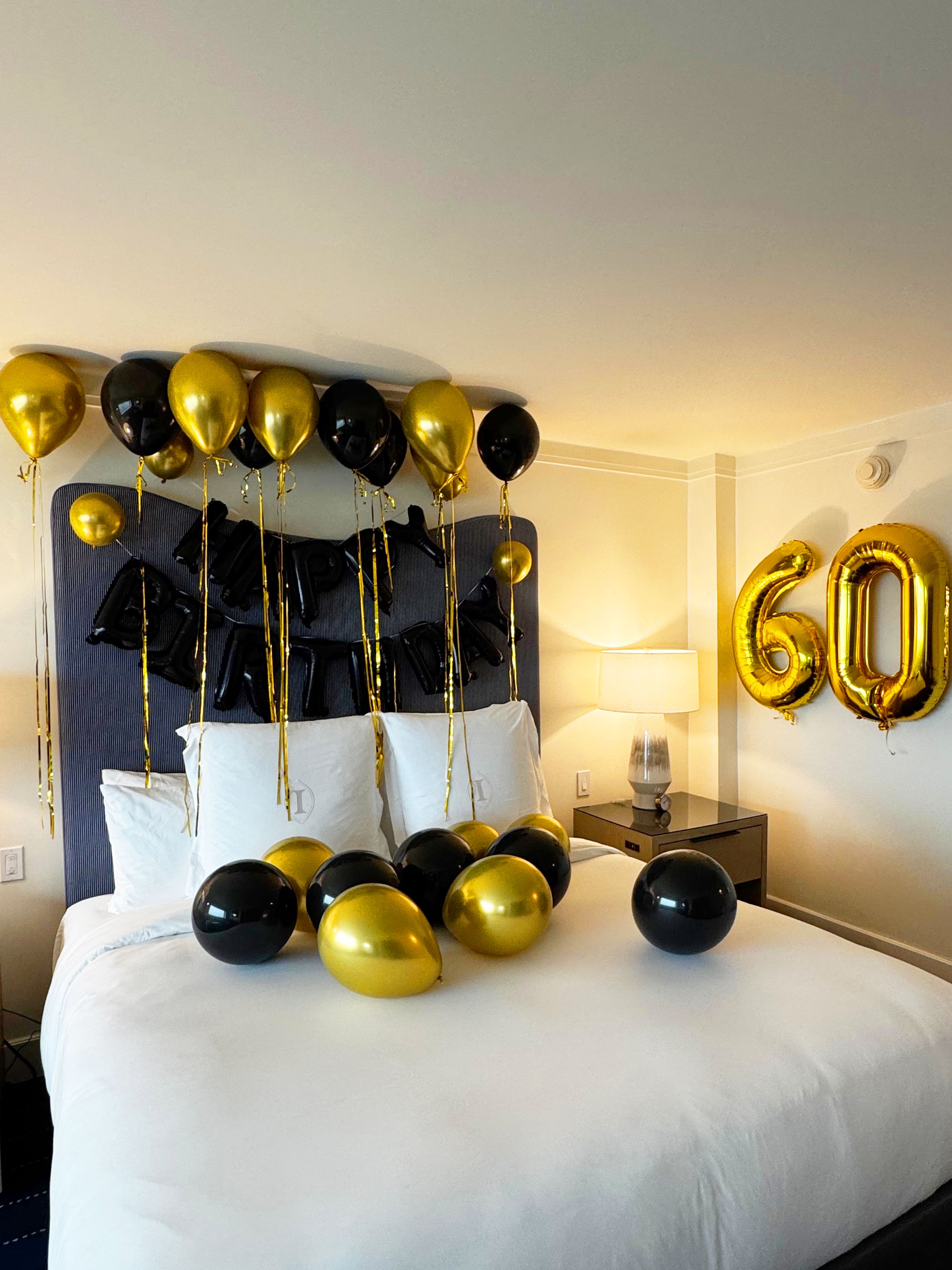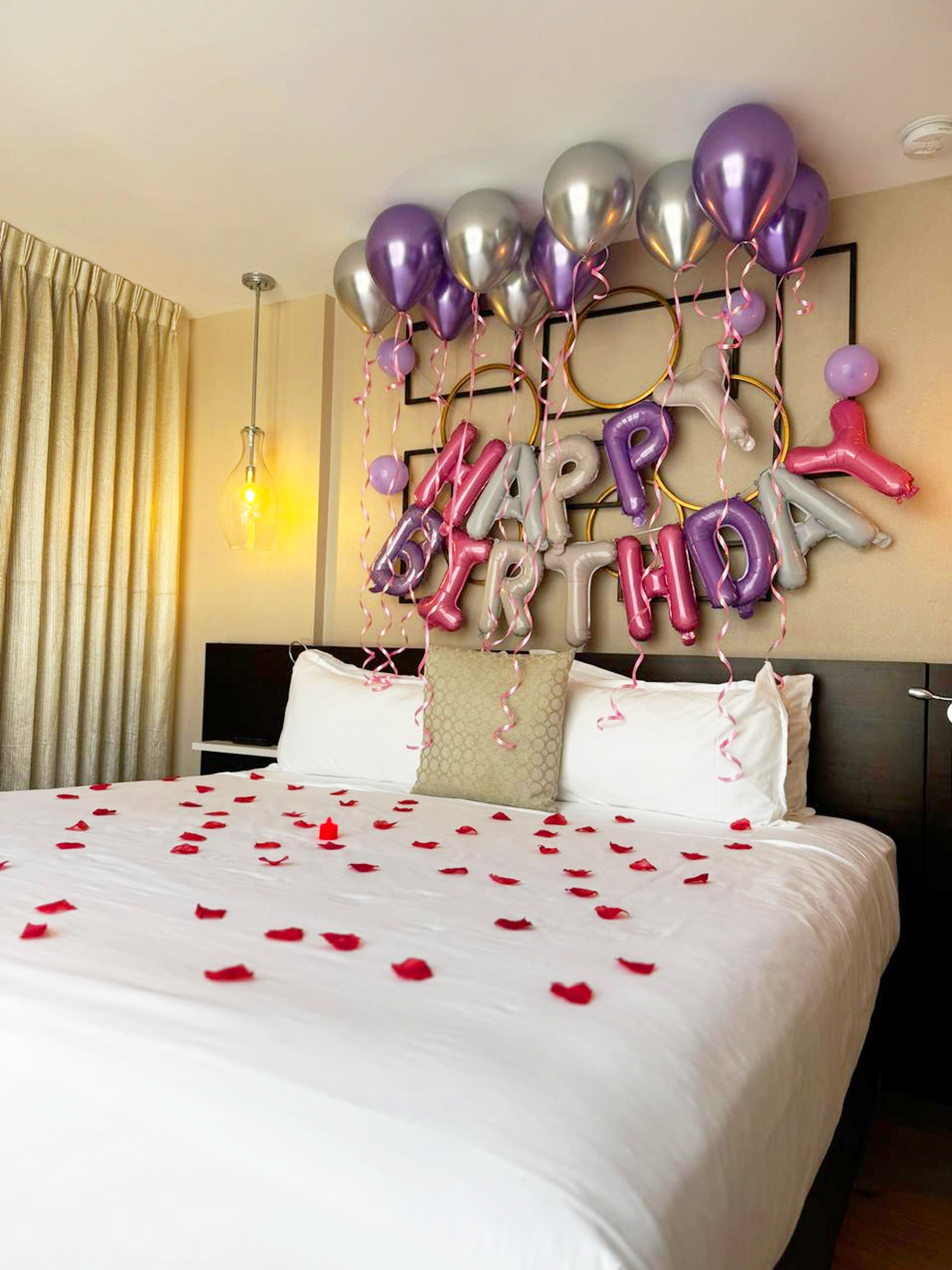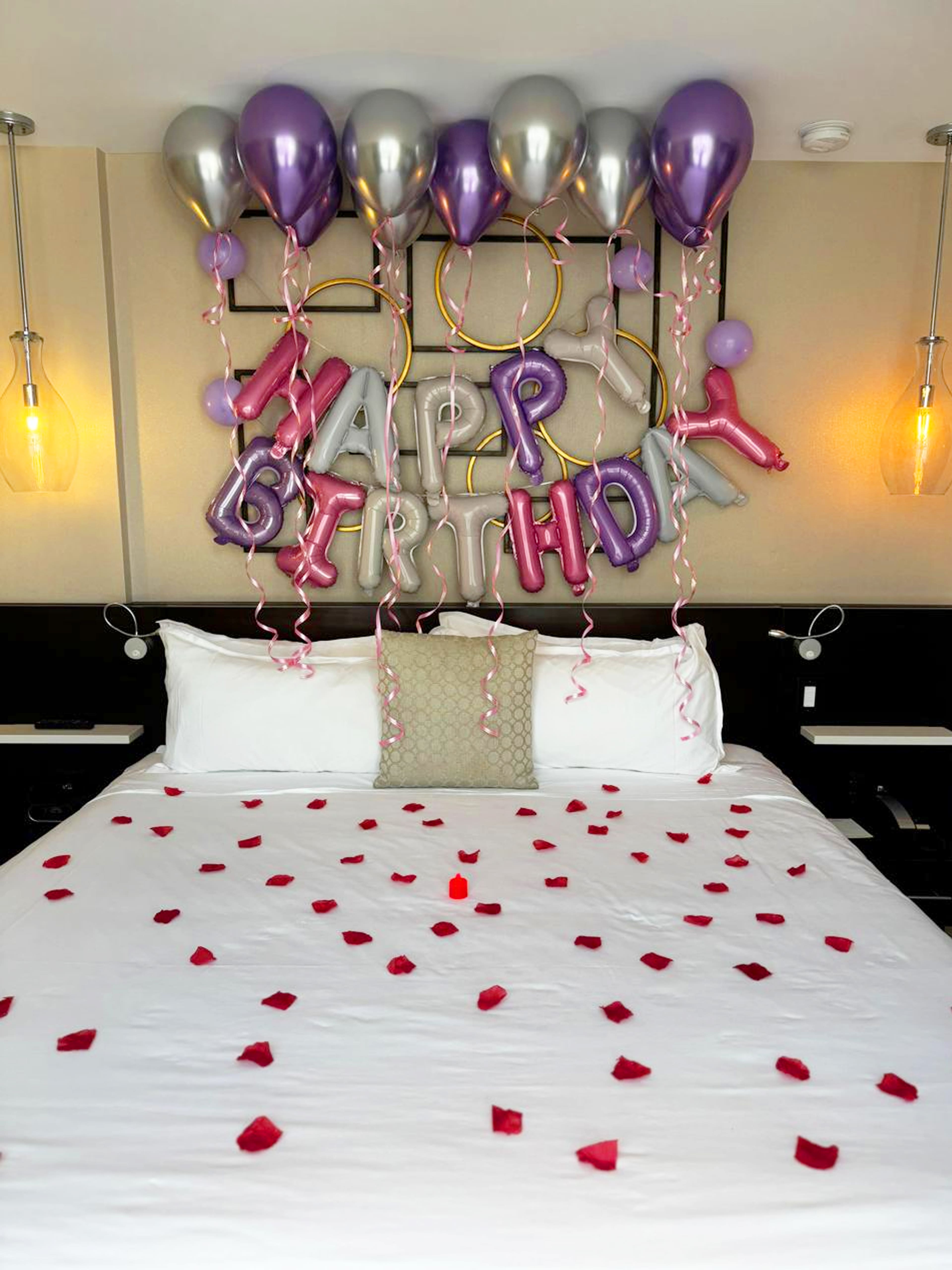 Surprise your loved one with balloons, banners, and a festive hotel room setup!.