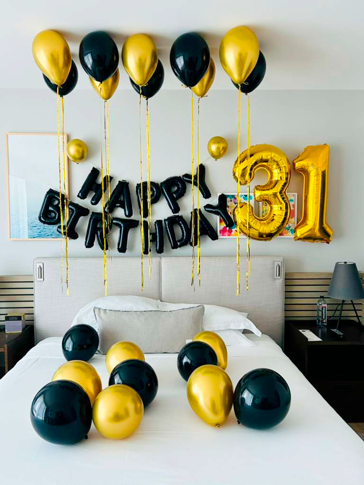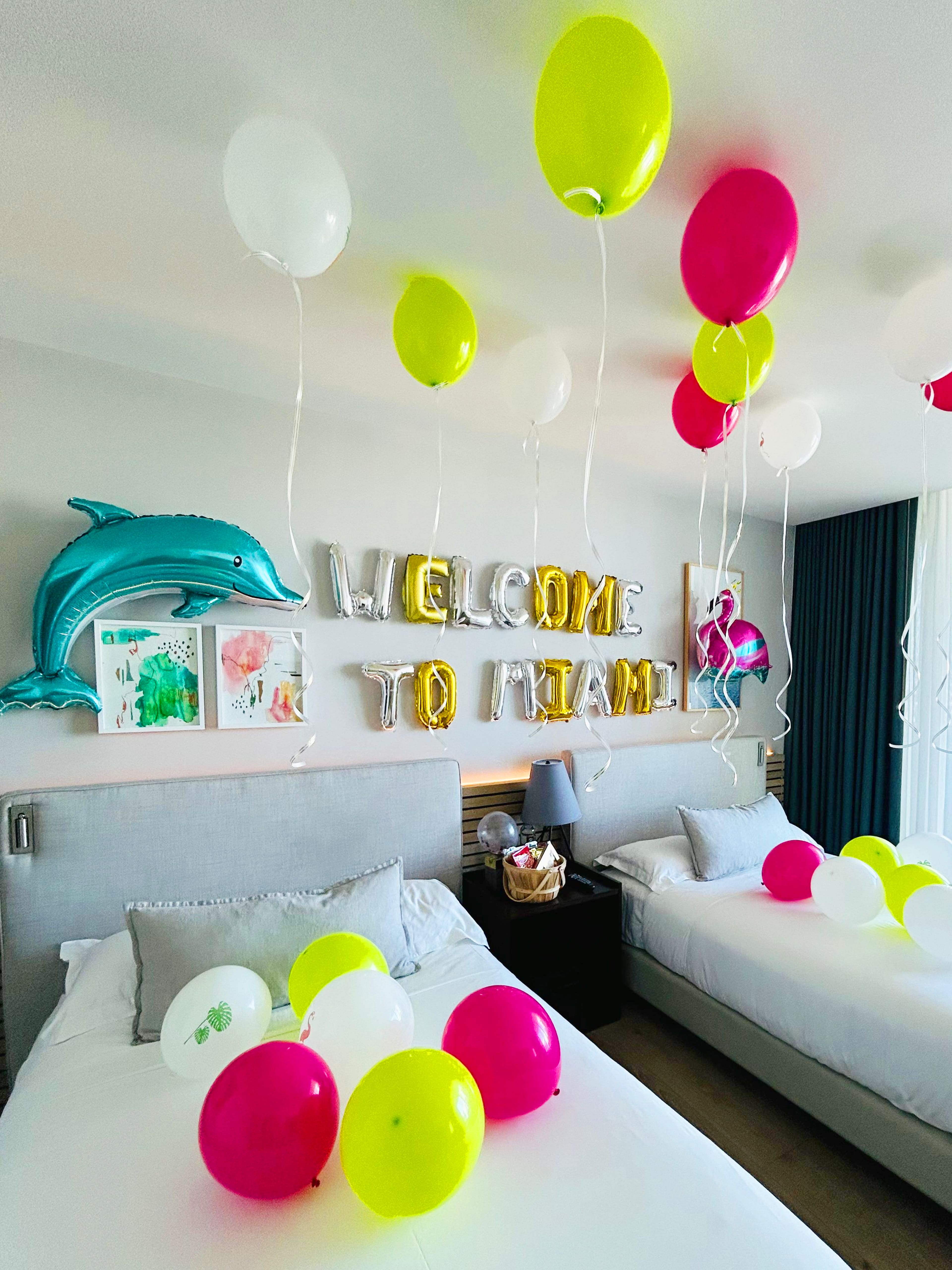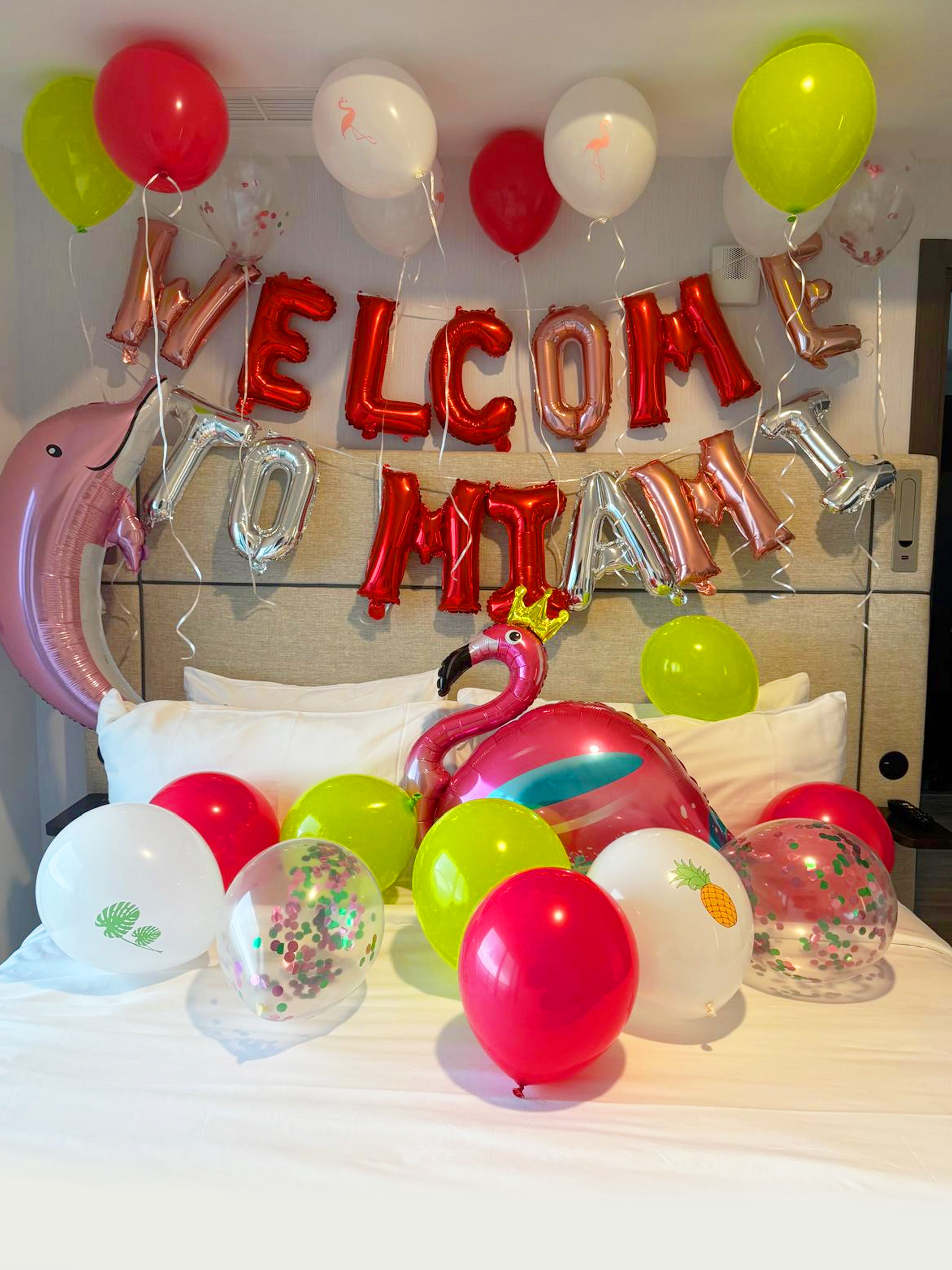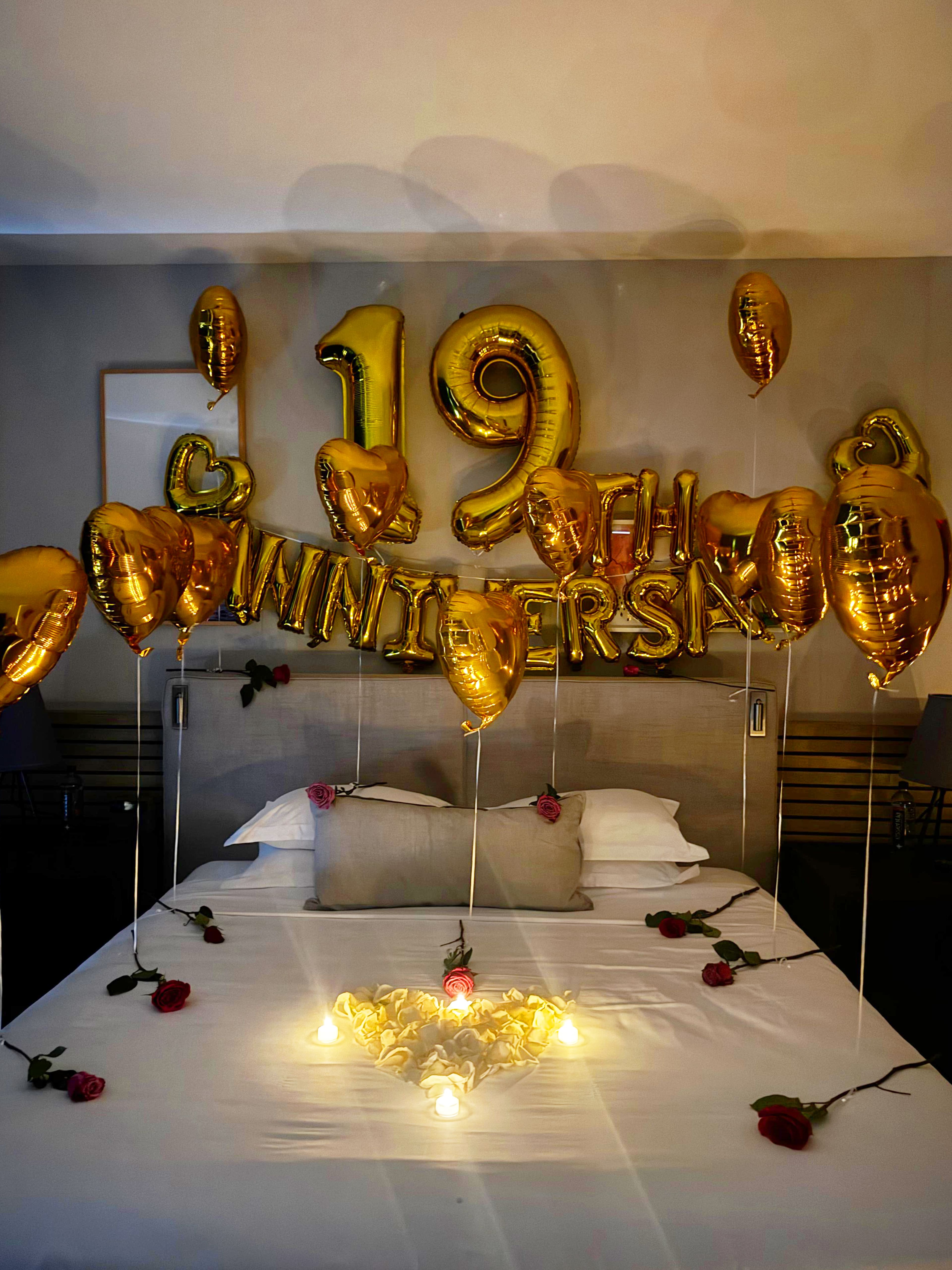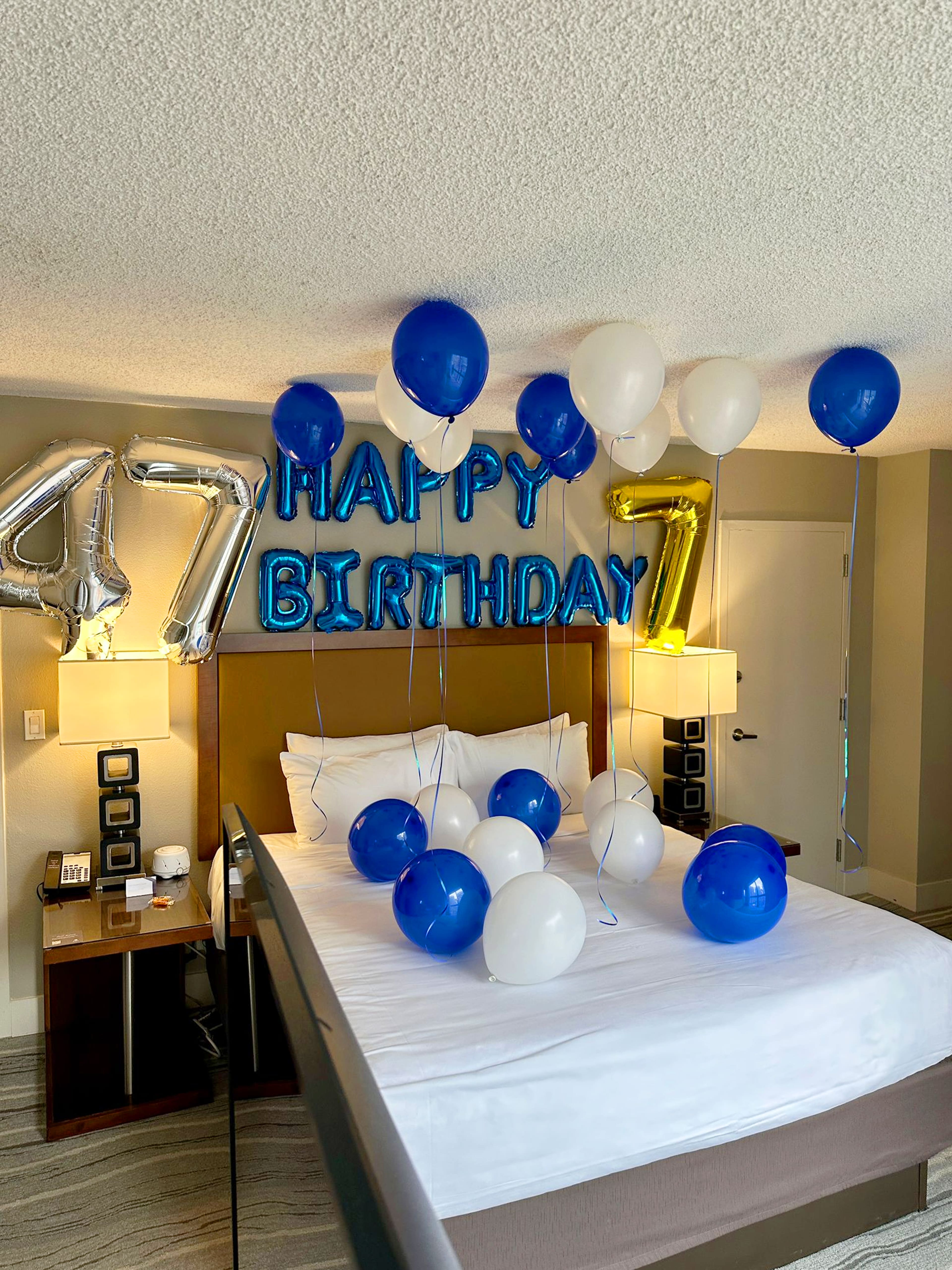 Surprise your loved one with balloons, banners, and a festive hotel room setup!.