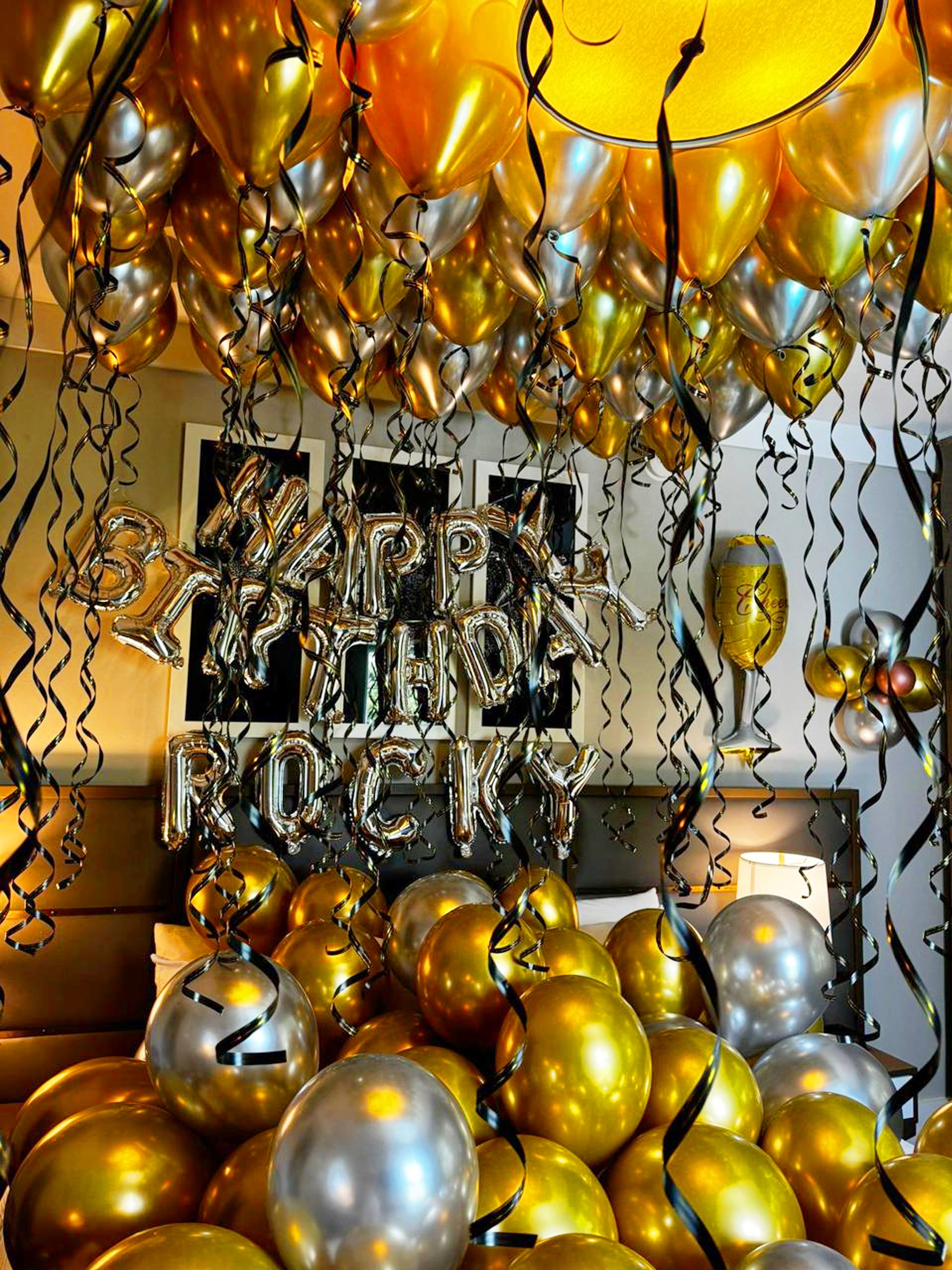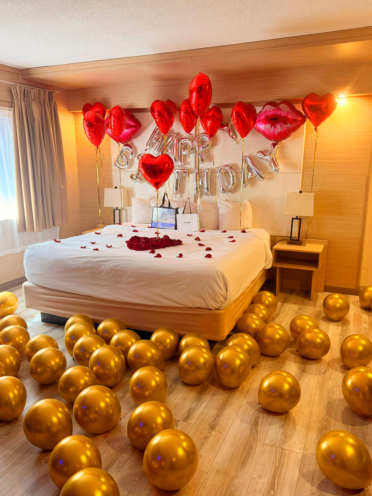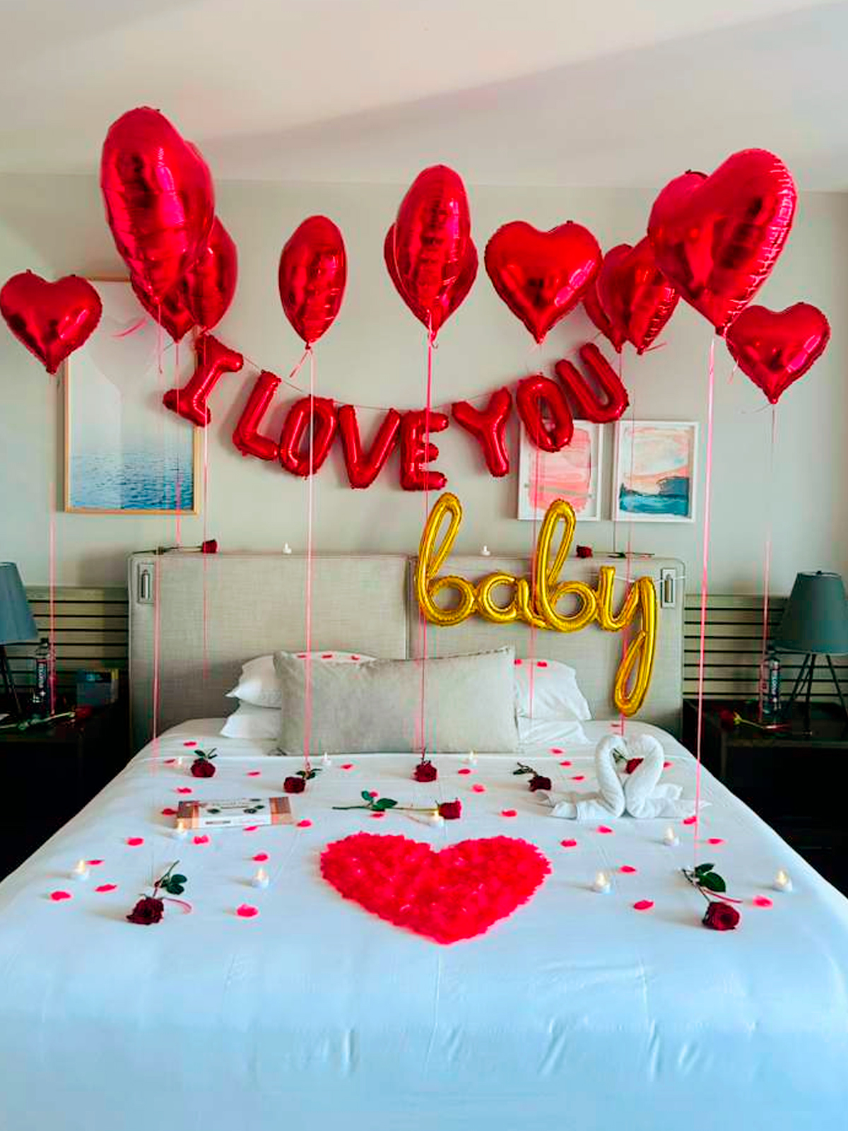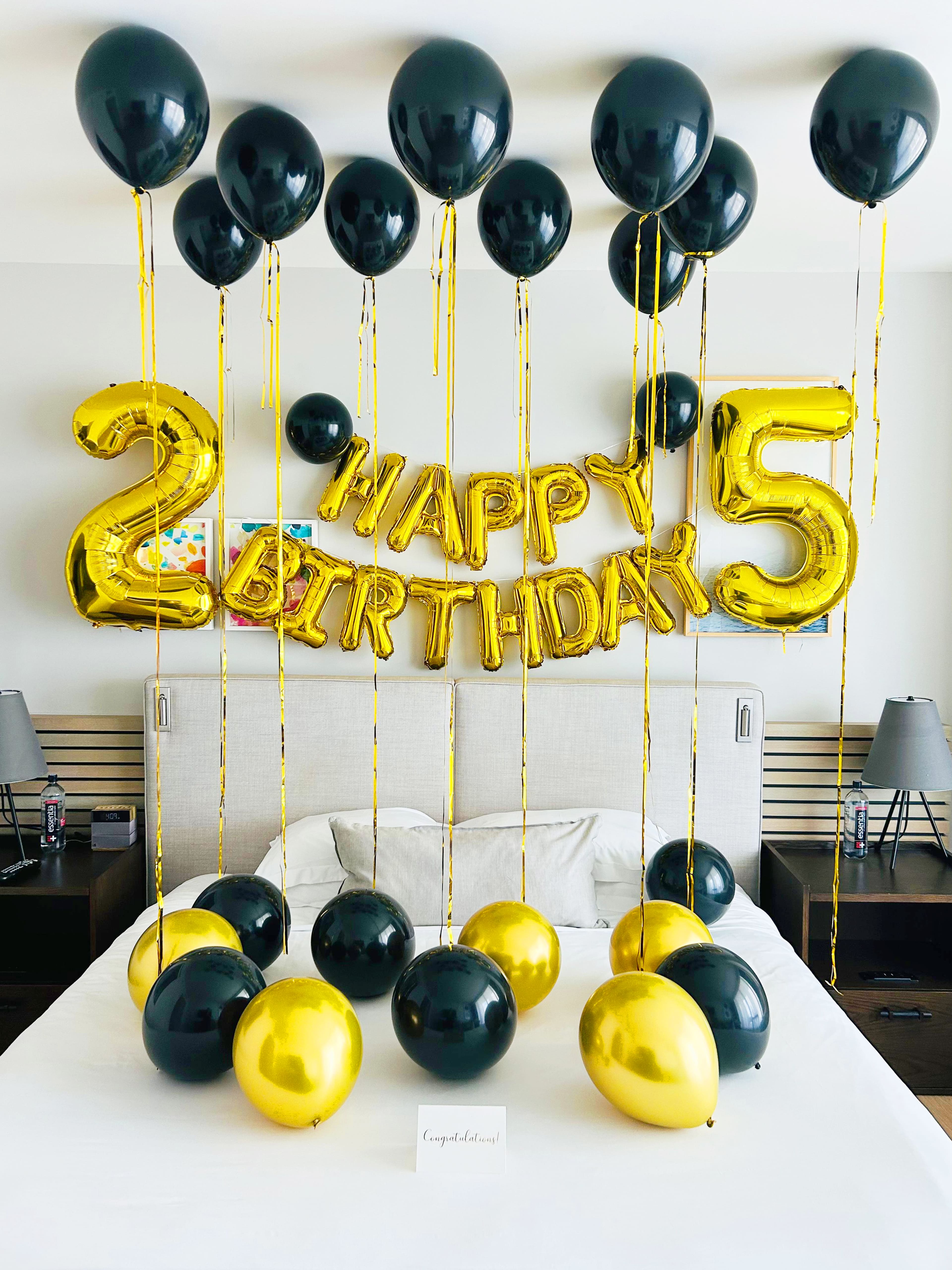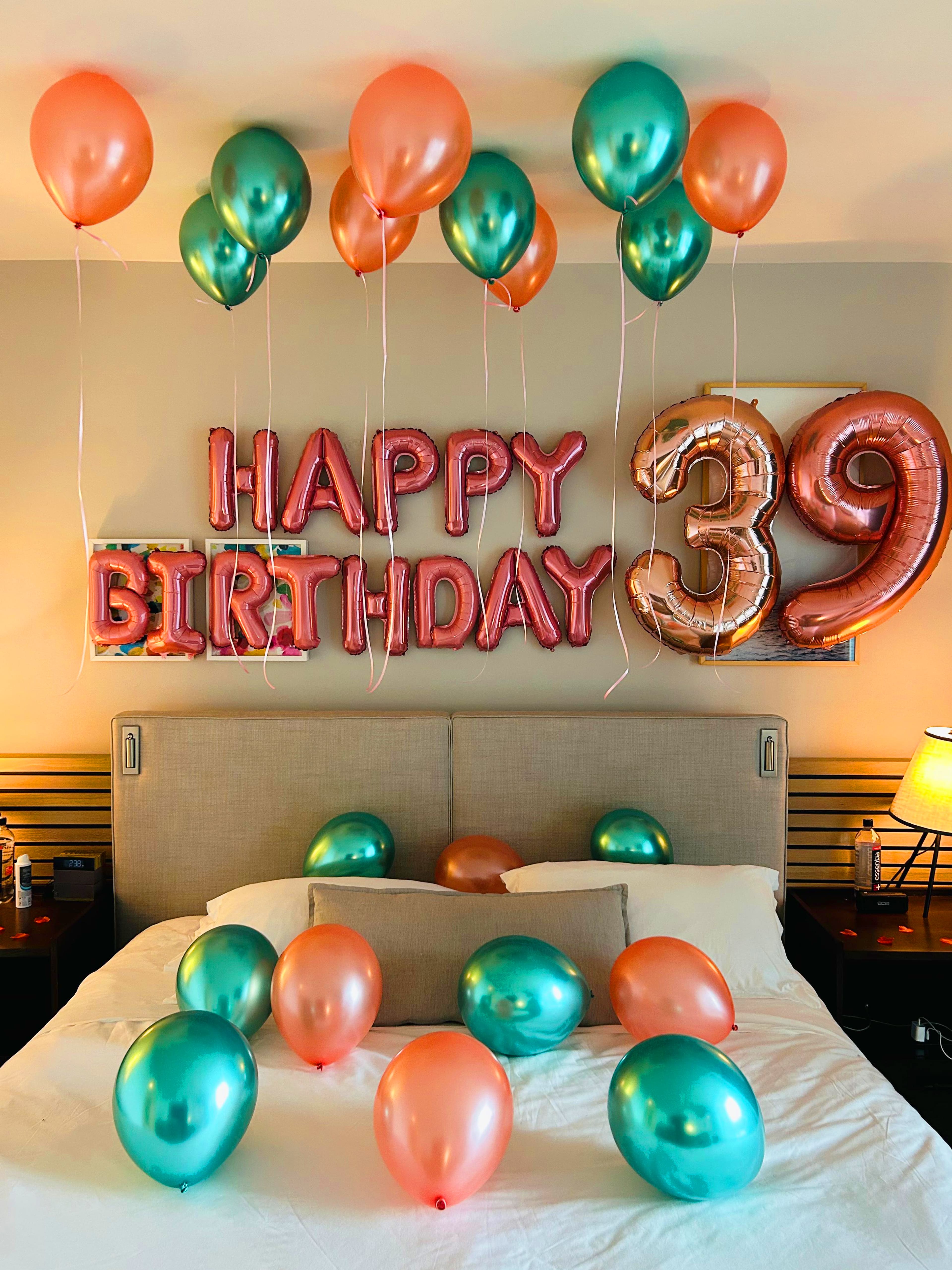 Surprise your loved one with balloons, banners, and a festive hotel room setup!.