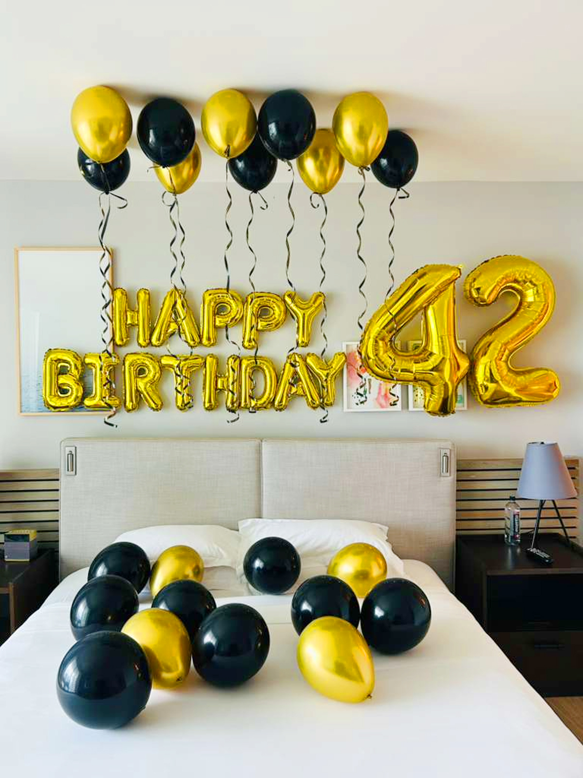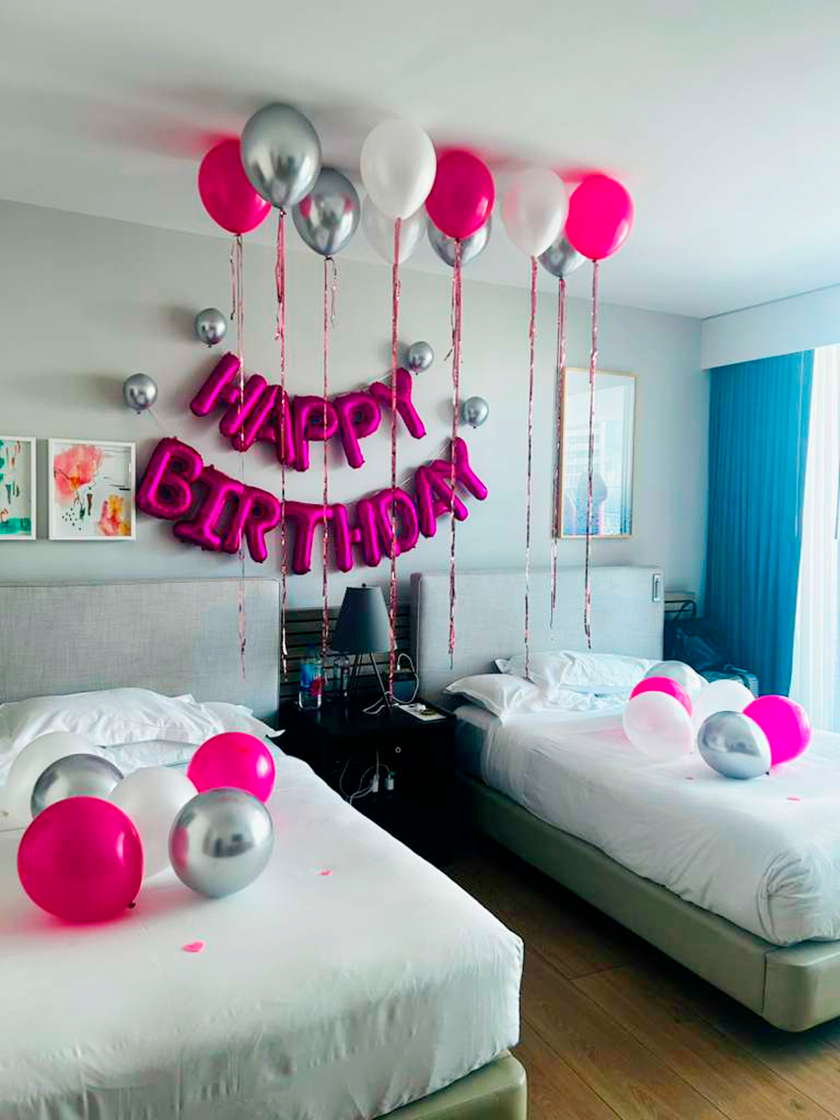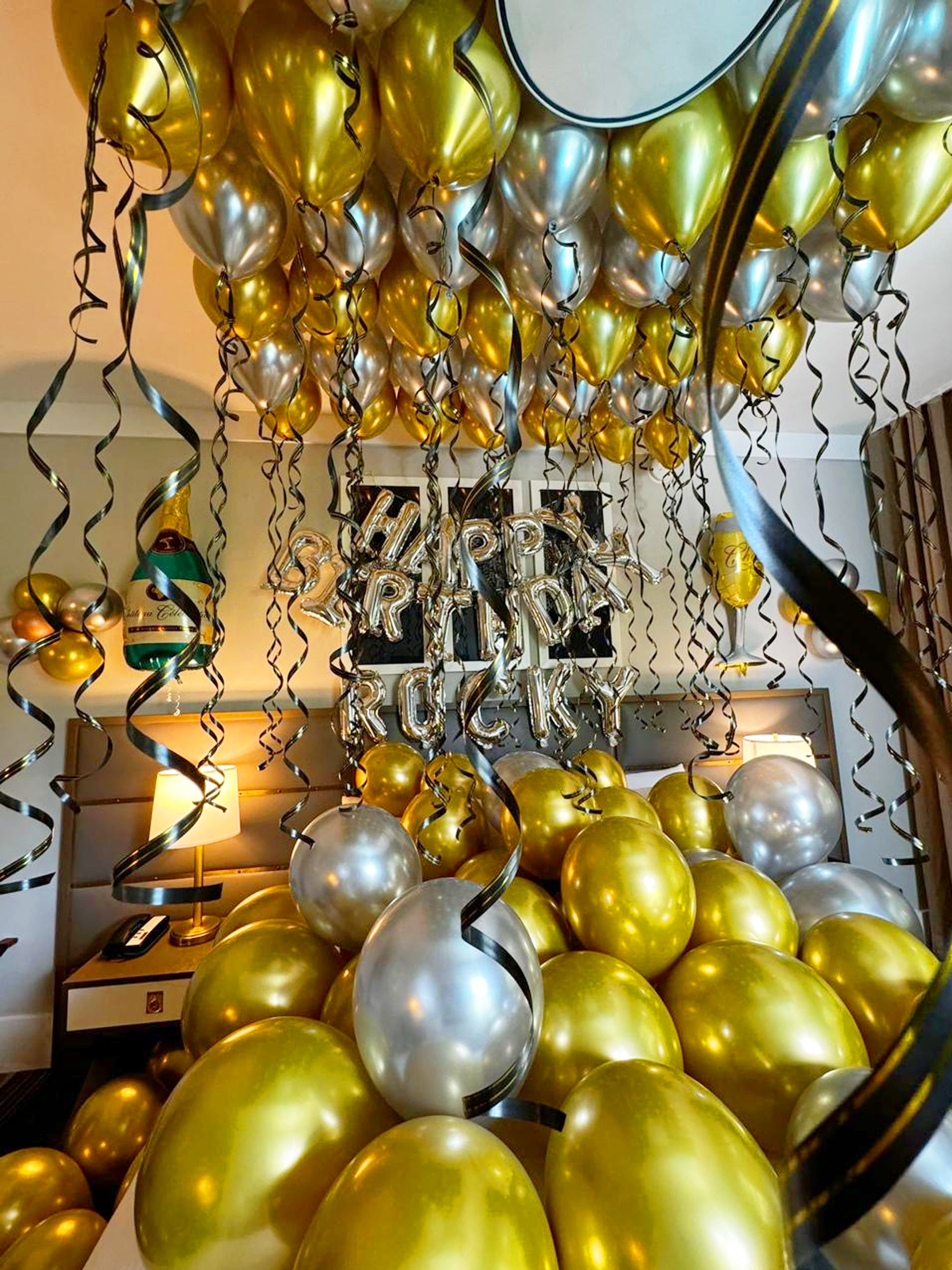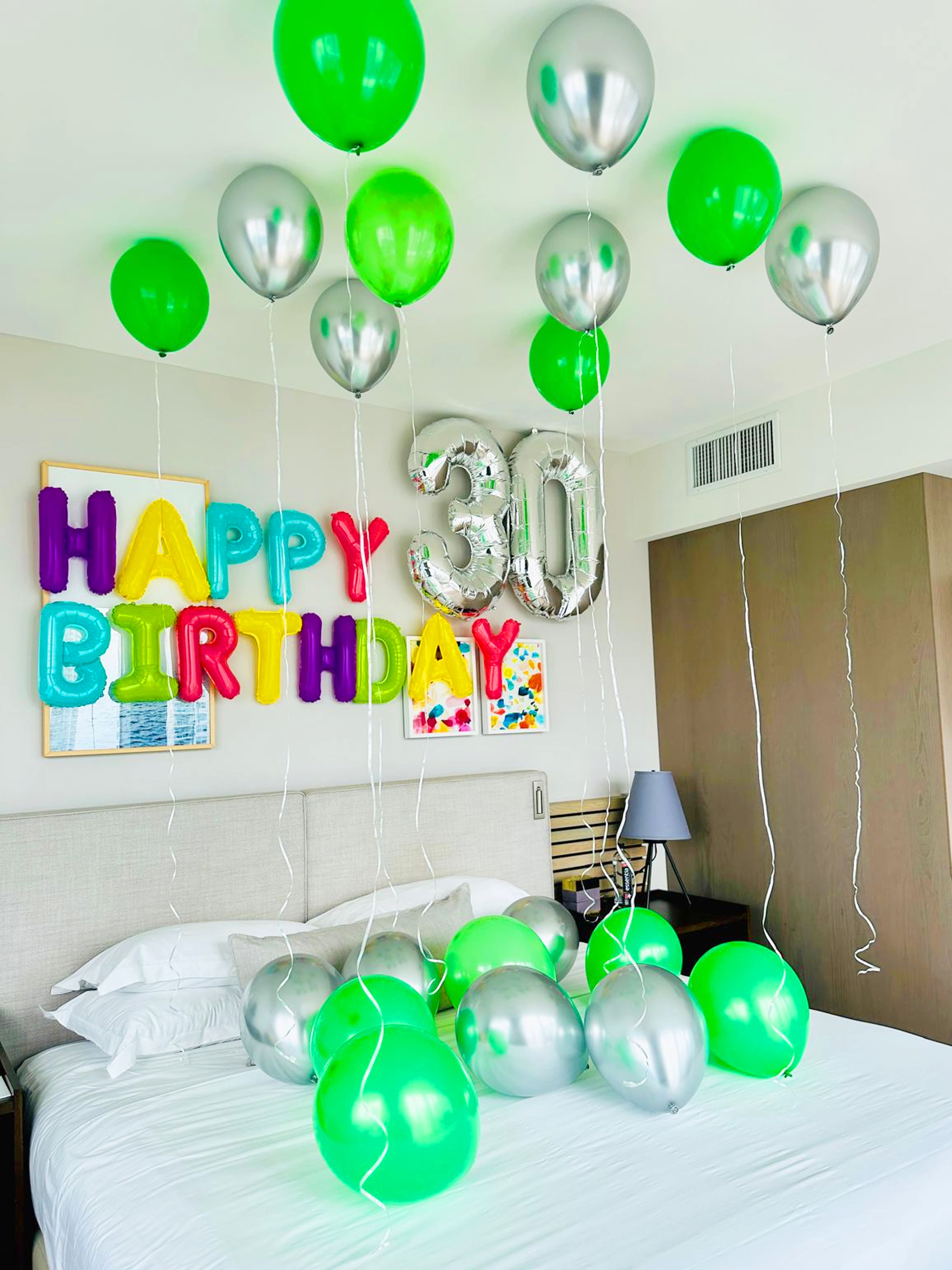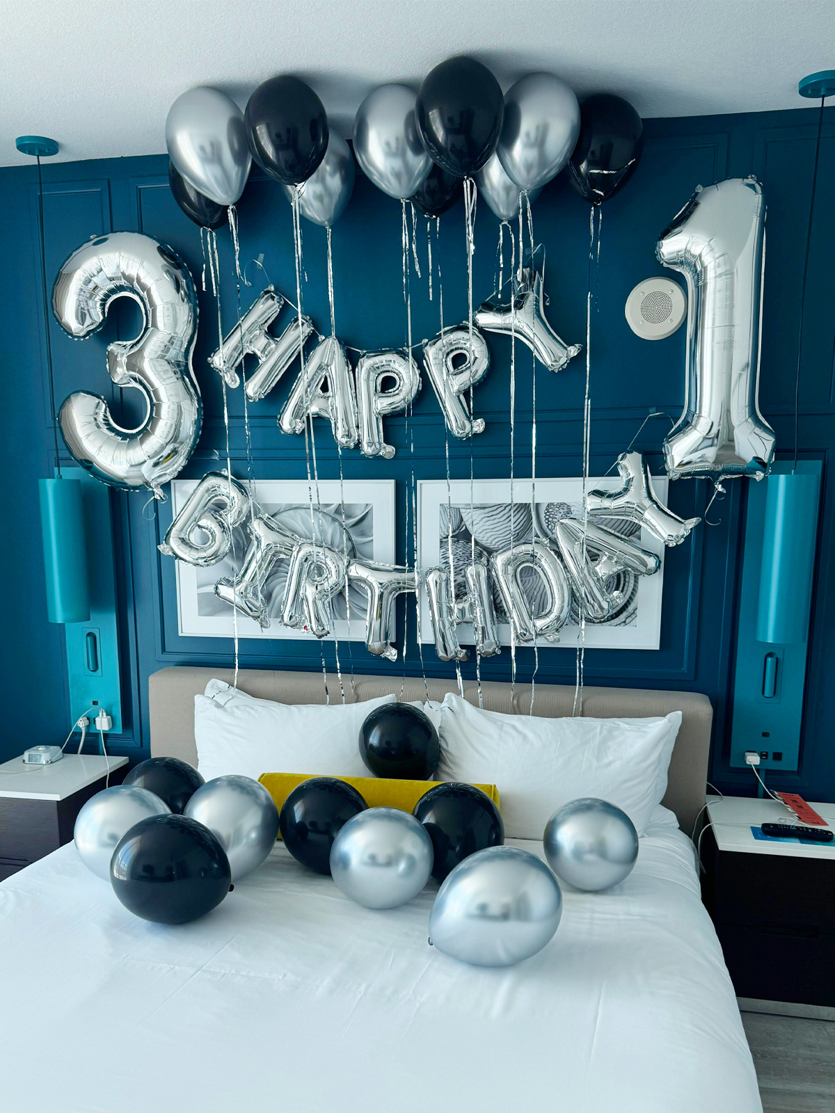 Surprise your loved one with balloons, banners, and a festive hotel room setup!.
