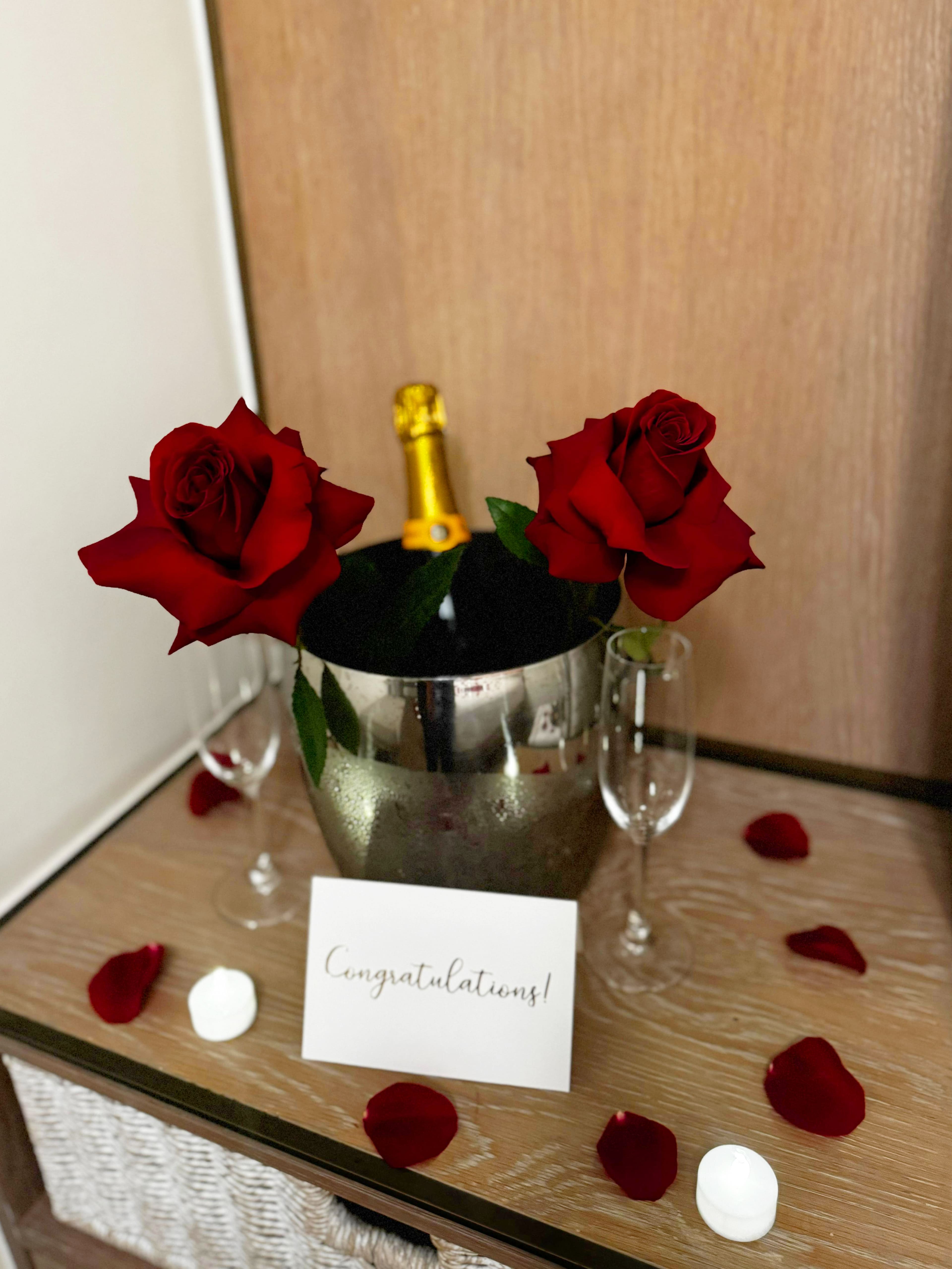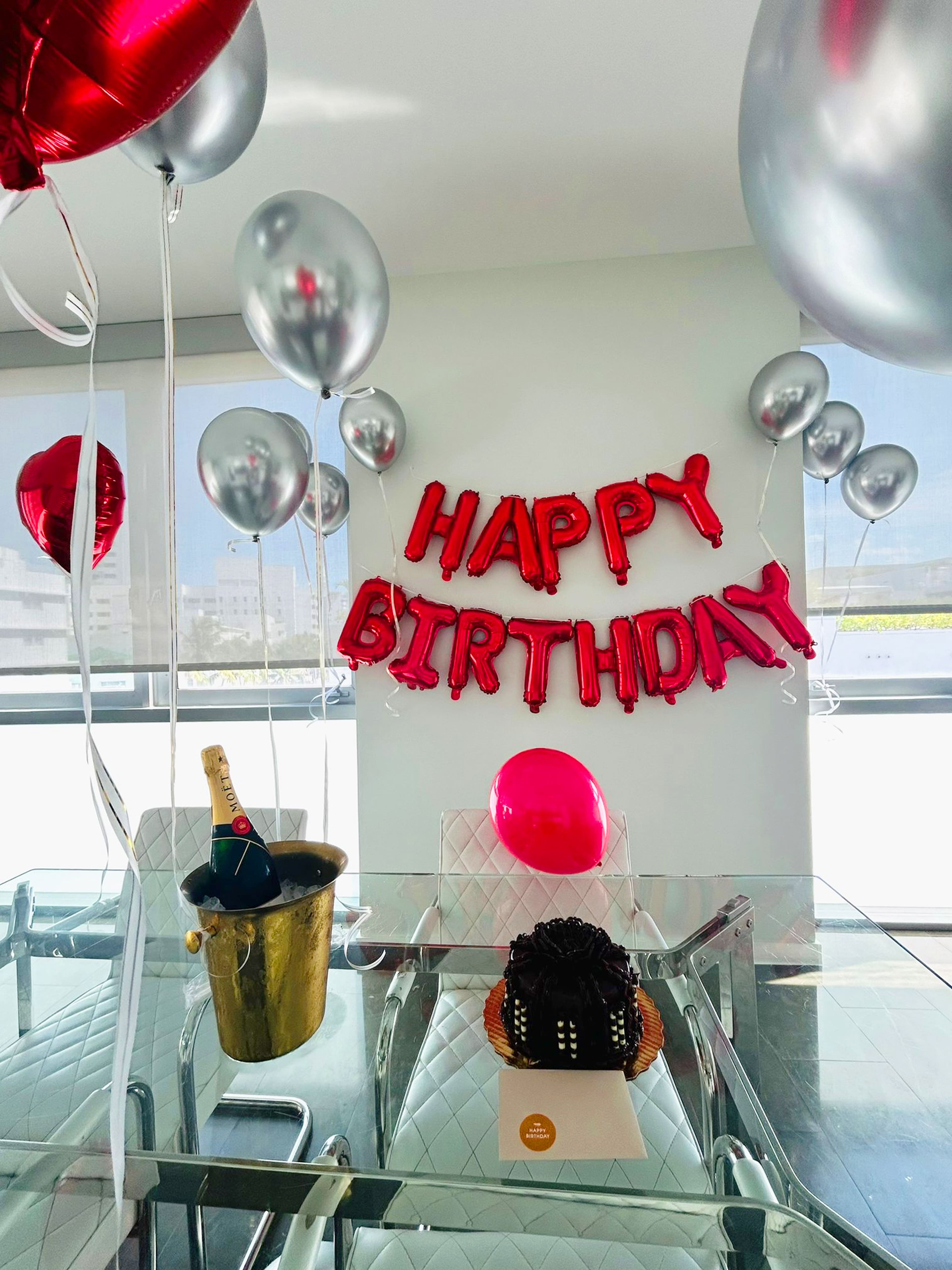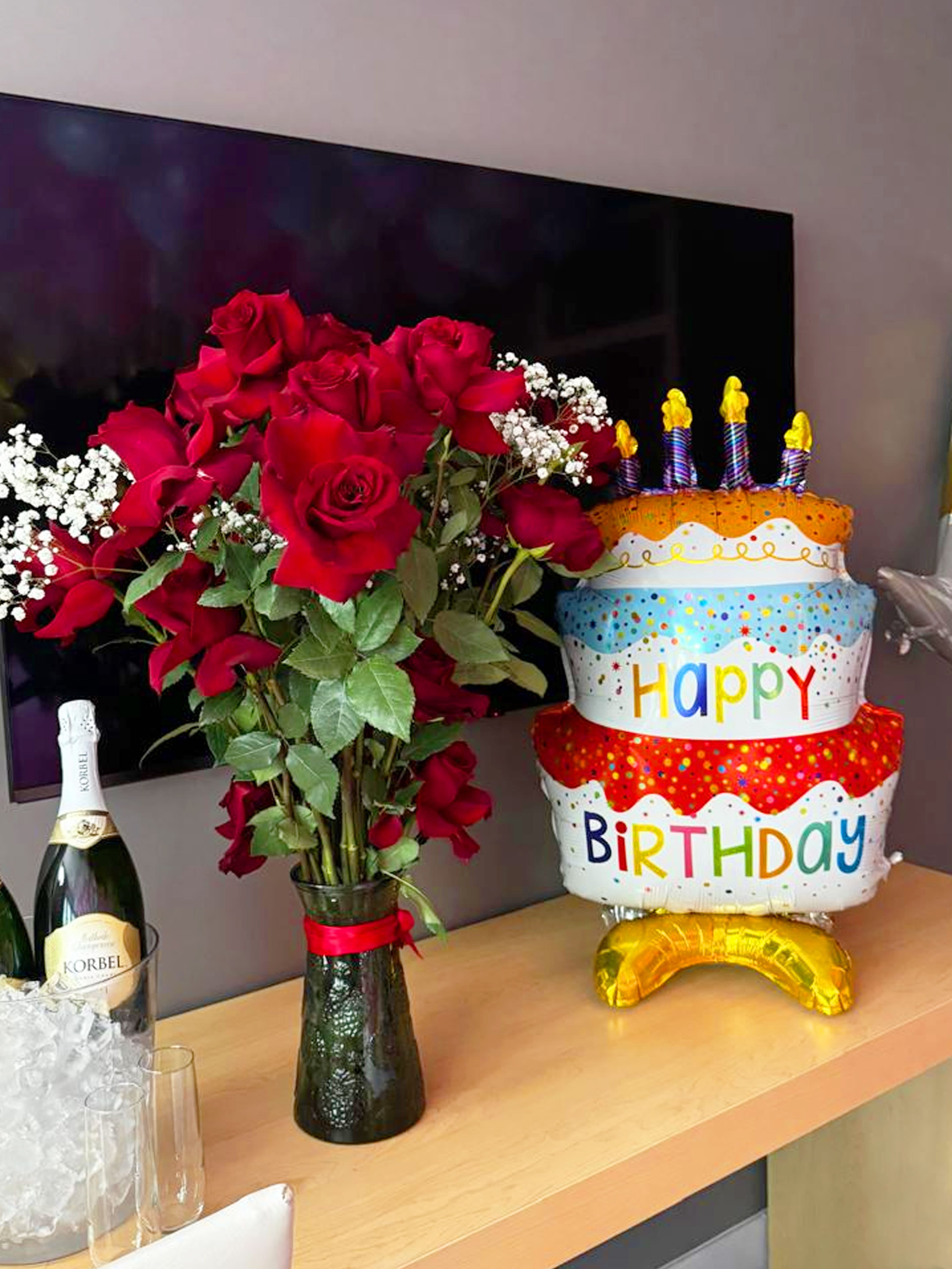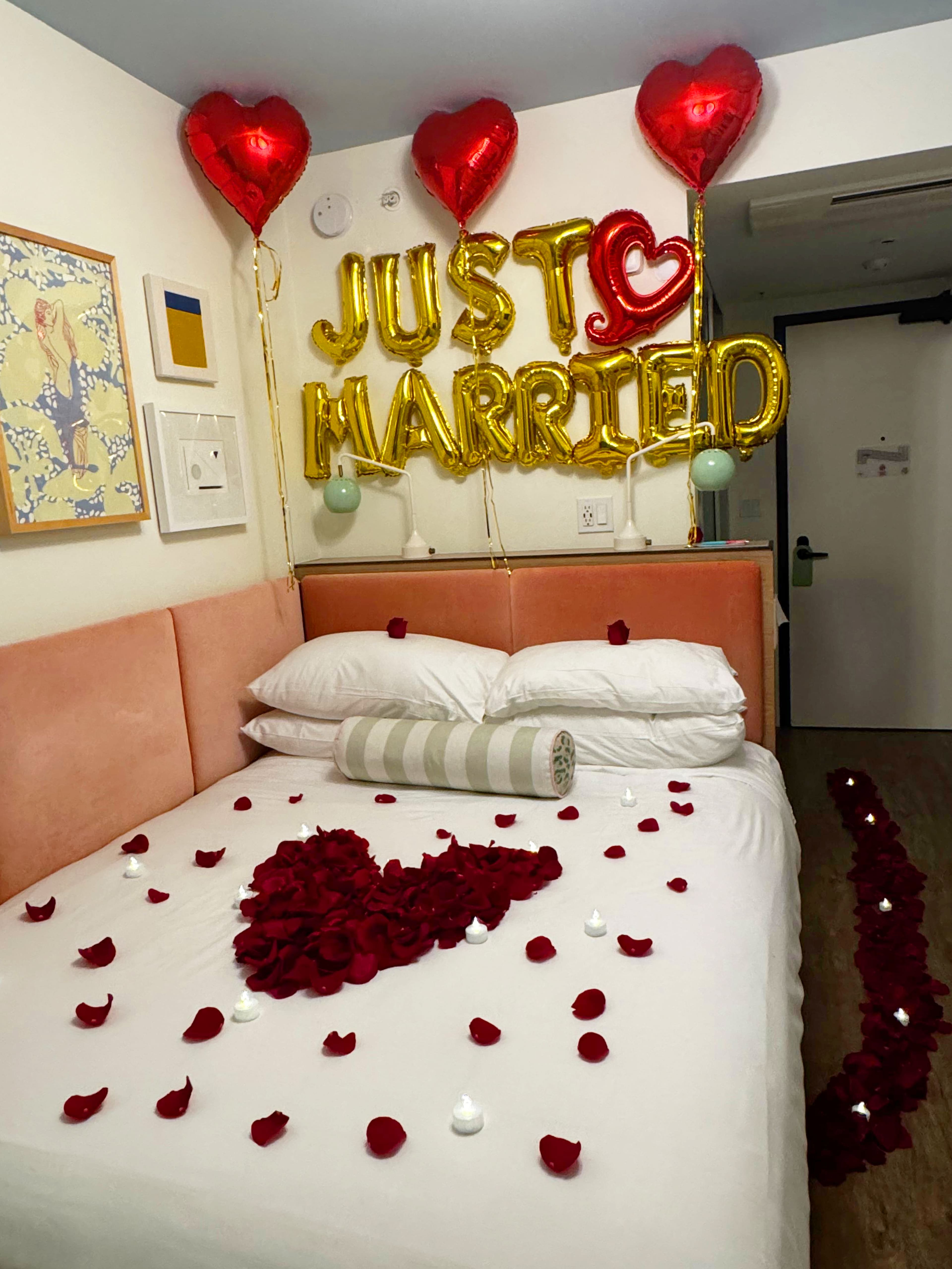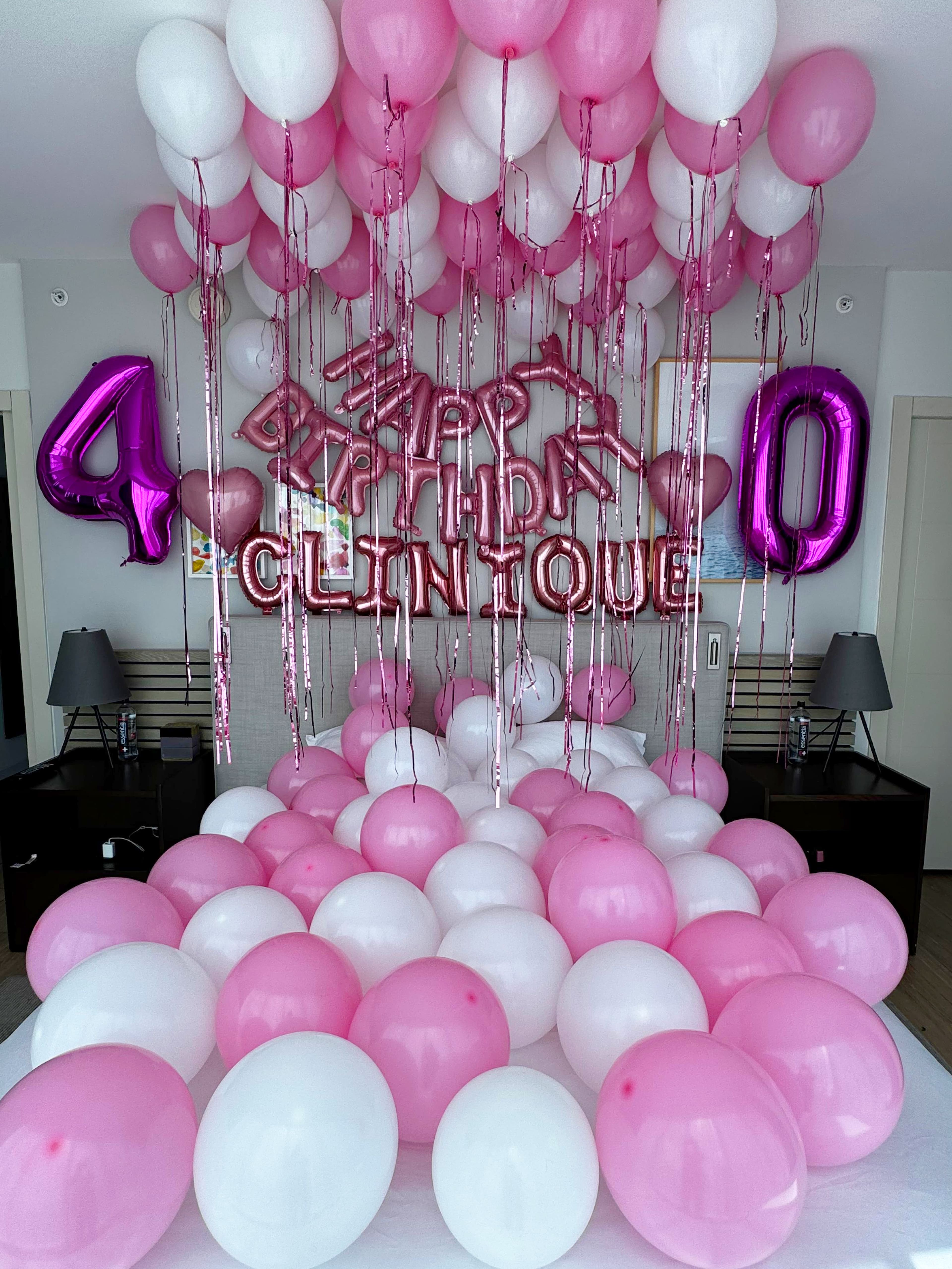 Surprise your loved one with balloons, banners, and a festive hotel room setup!.