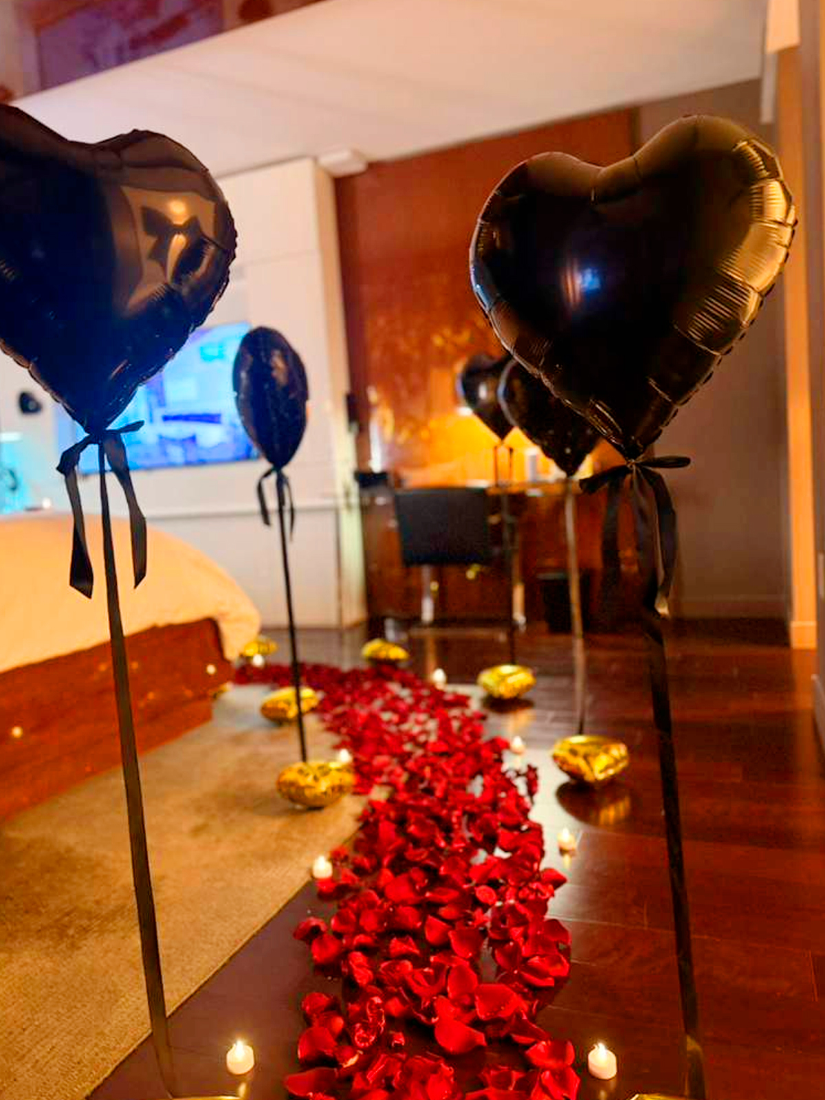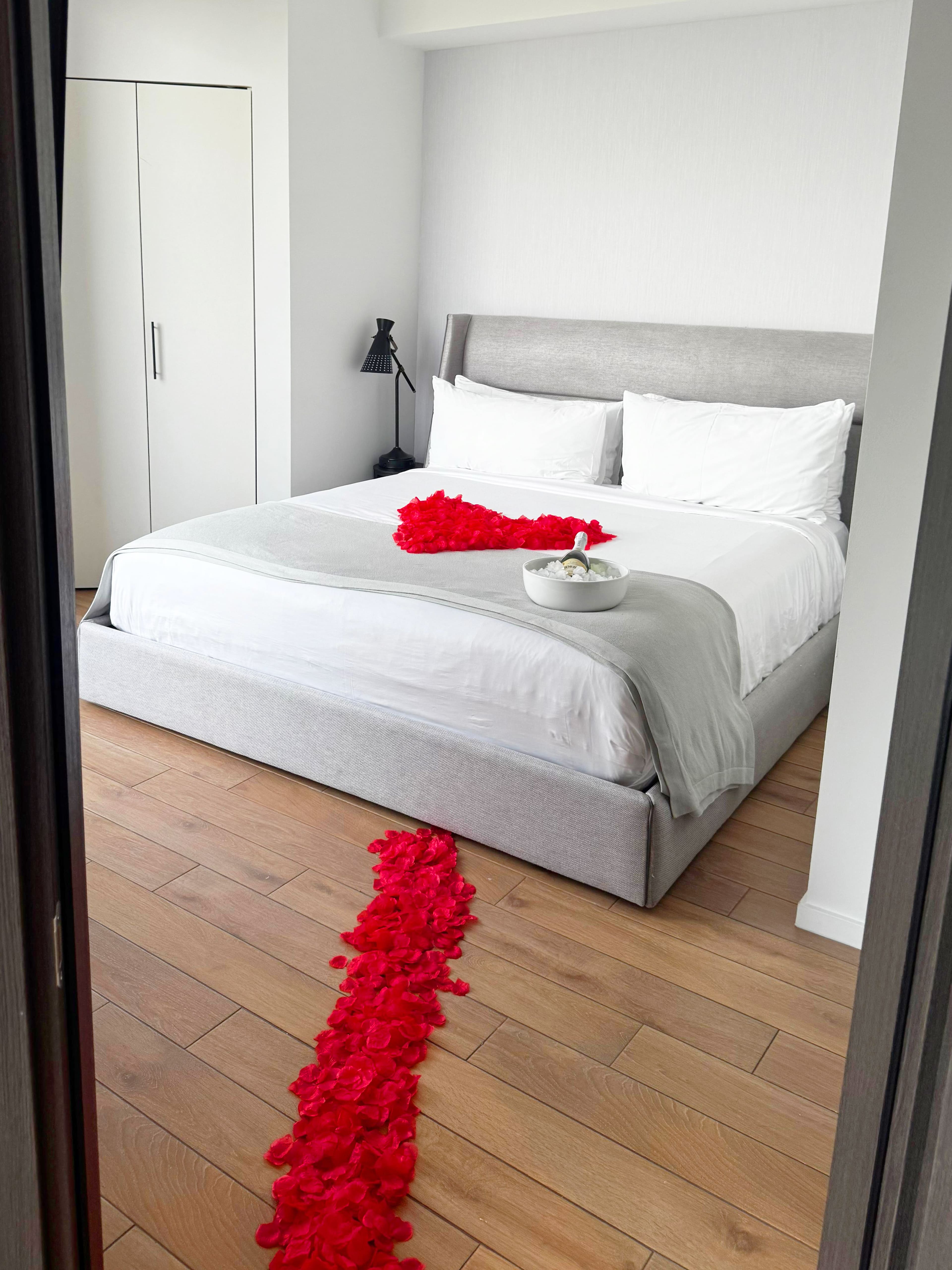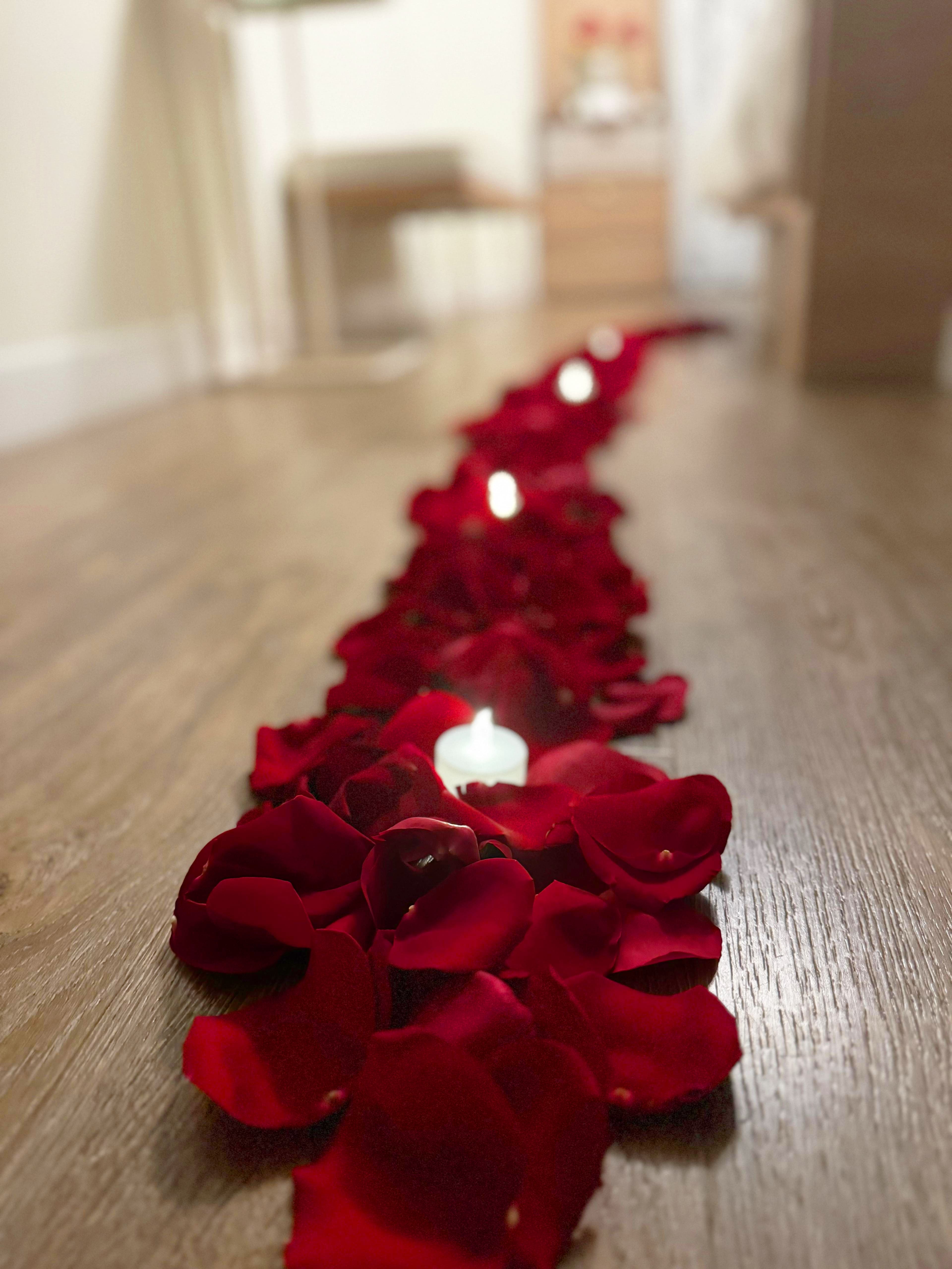 Create a magical ambiance with rose petals, candles, and elegant romantic decor!.
