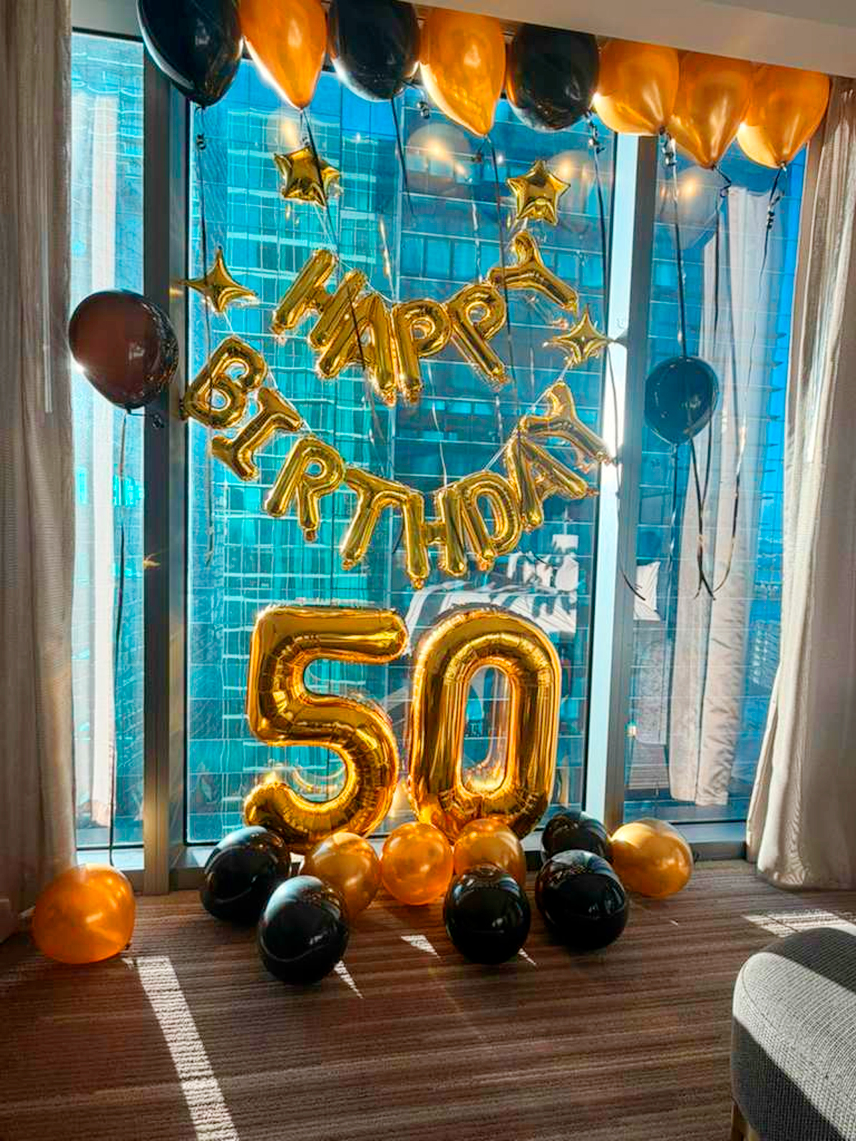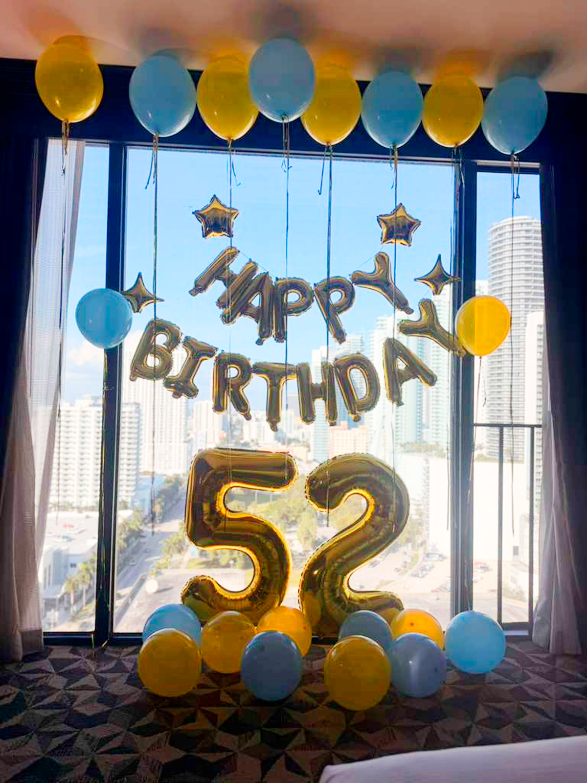Surprise your loved one with balloons, banners, and a festive hotel room setup!.